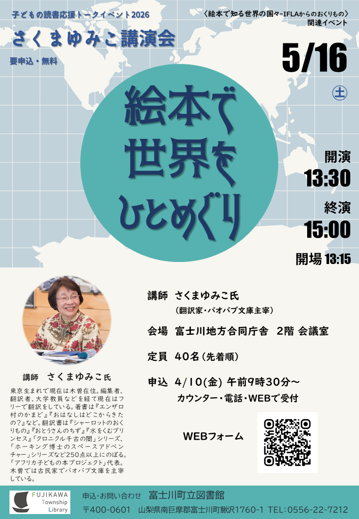 - 5/16 【子どもの読書応援トークイベント】〈絵本で世界をひとめぐり〉講師:さくまゆみこ氏