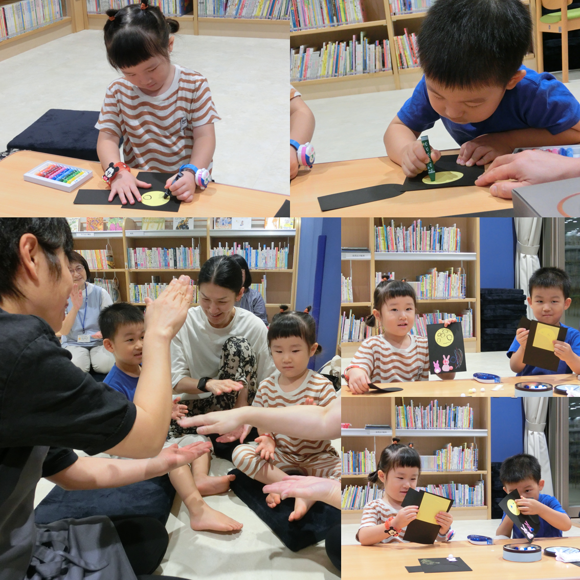 9月のテーマは「夜のお楽しみ」です。最初の絵本は、ママが帰ってくるまでのおるすばんの絵本です。こんなおするばんだったらいいかも!疲れたらやっぱりおふとんに入りたいよね?みんなでぬくぬく気持ちがいいね。おふとんに入っている間、夜はどんなことがあるかな?ネコしか知らない秘密の夜のお話。次は、山奥の湖の月夜のお話。ナンセンス絵本は、ドロップインしていた中学生も思わず笑っていましたよ。手遊びは、向かい合って「十五夜さんのもちつき」だったので、みんなで楽しみました。最後は、おはなし会で初めてのストーリーテリング(素話)です。ちょっと長いおはなしでしたが、しっかり聞いてくれました。月の満ちかけのおはなしだったので、工作もお月さまが満ちかけするカードを作って楽しみました。ご参加ありがとうございました。