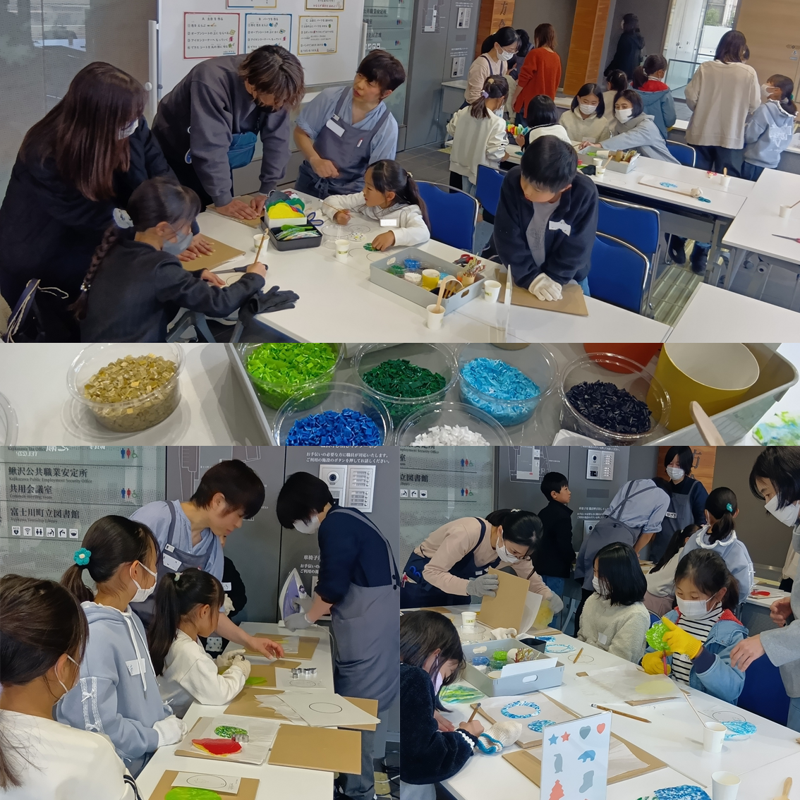材料は、ペットボトルキャップ。細かく刻んだカラフルなキャップを数色選んで、まずはオーナメントの土台作りです。これをアイロンで溶かして伸ばす作業があります。どんな色合いになるのか、楽しみにしているようすが微笑ましかったです。その後は好きな色のシートを選んで、好みの型で形をつけます。その跡に沿ってはさみで切って、土台にボンドでレイアウトして完成となります。