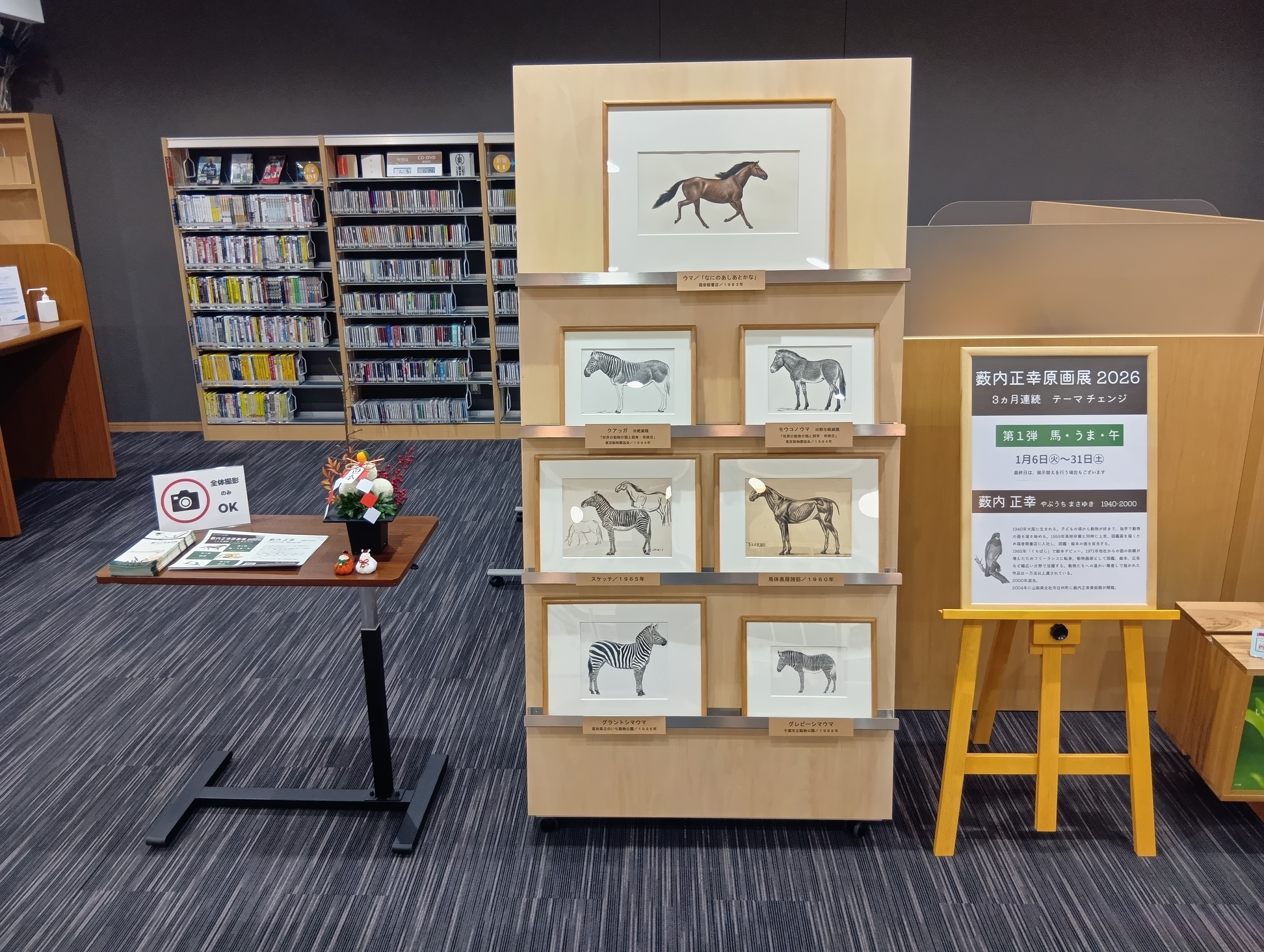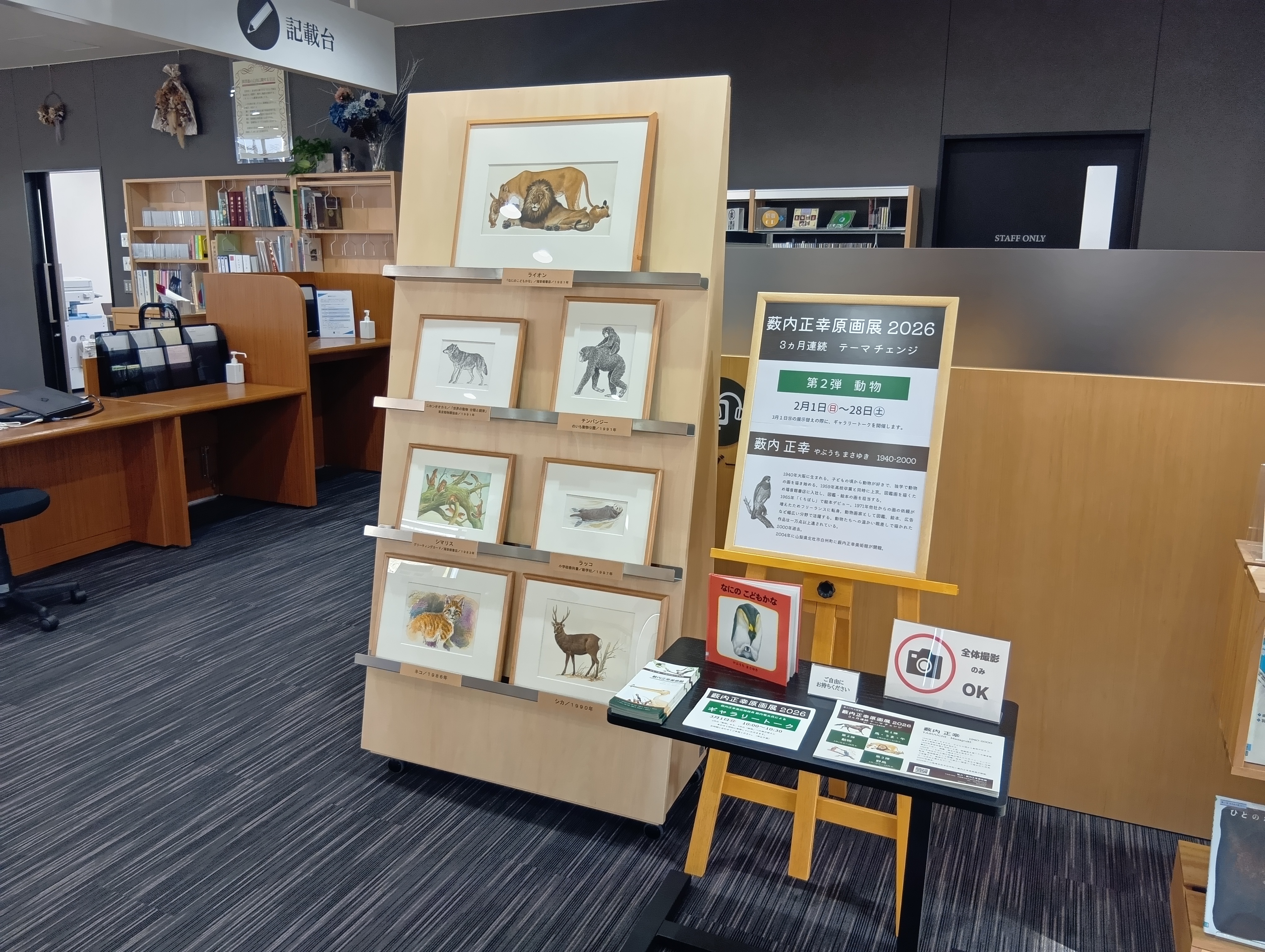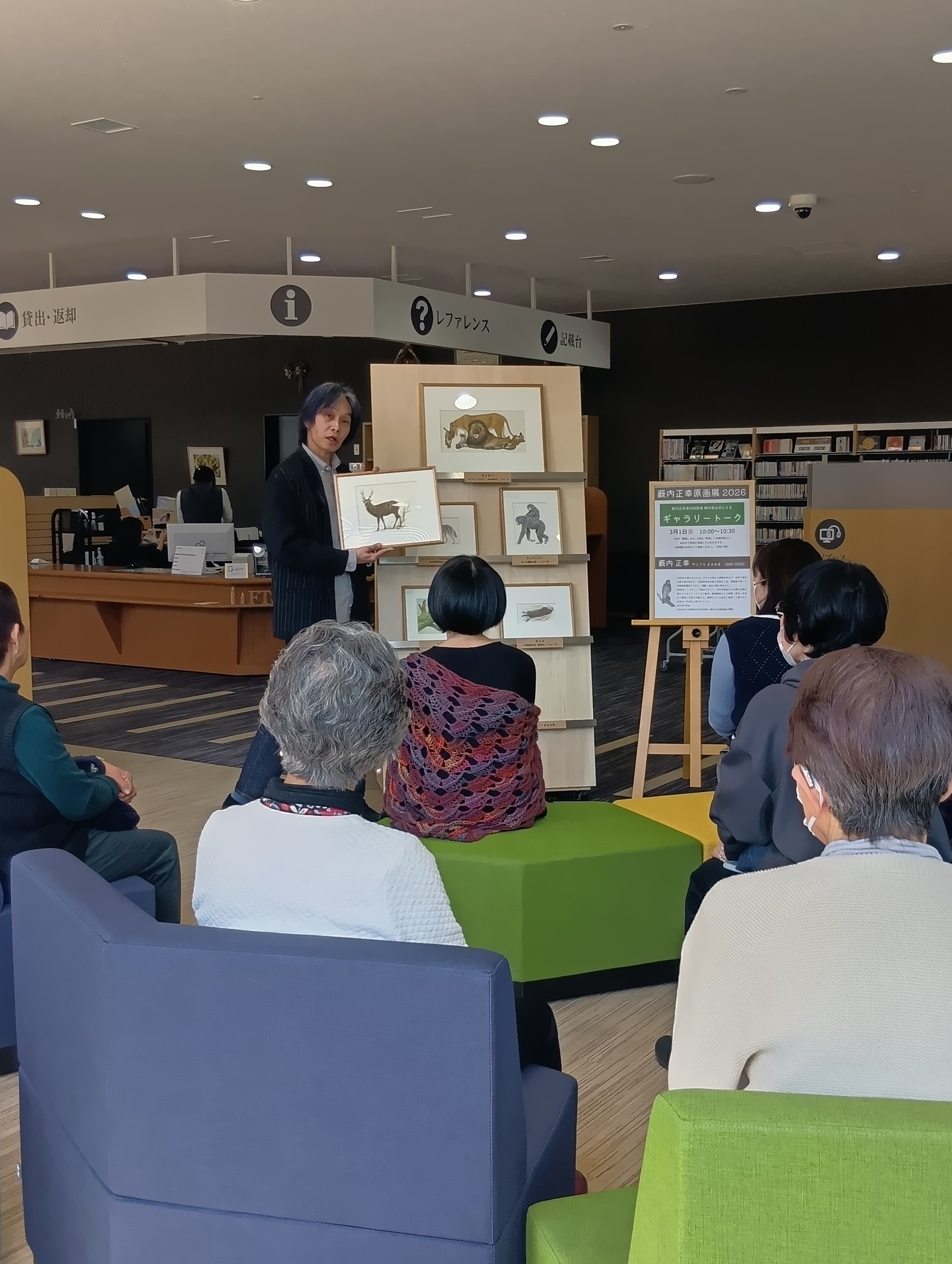 3ヶ月連続テーマチェンジの薮内正幸原画展。1月は「うま・馬・午」、2月は「動物」、3月は「野鳥」とリレー。点数は少ないのですが、薮内正幸美術館のご協力のもと、毎月原画鑑賞ができる場を提供できたことは、当館としては非常に嬉しいことでした。せっかくの機会なので、展示替えの際にギャラリートークして欲しいと藪内竜太館長に依頼したところ、快く引き受けてくださいました。