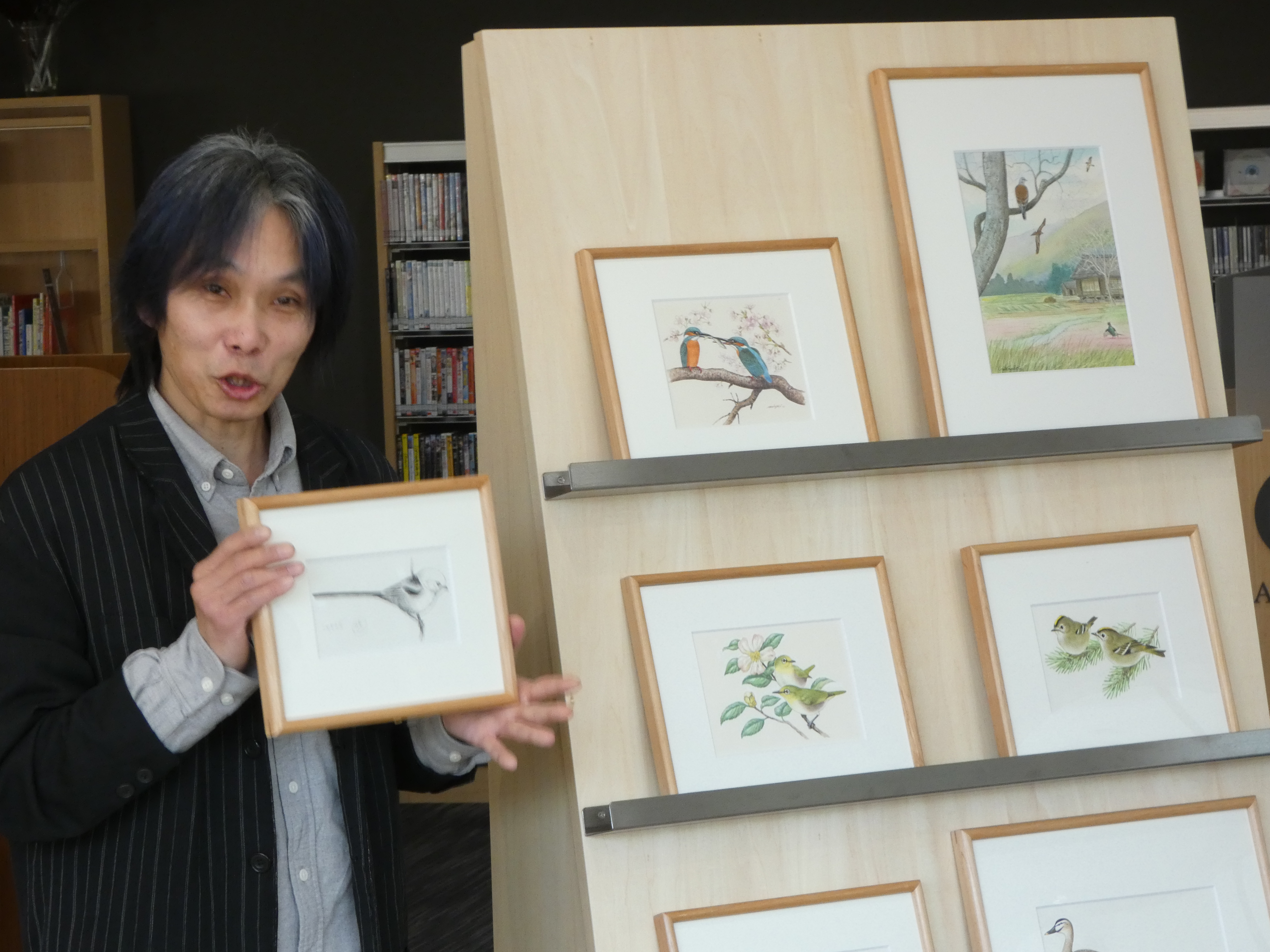 解説が終わると、原画とキャプションを展示棚から外していき、最後には空っぽに。そこに、3月の展示「野鳥」を一点一点解説しながら設置していきます。今回も初公開の作品をご用意いただきました。その中の一点が「シマエナガ」です。シマエナガは、エナガの亜種であり、正幸さんがご存命の頃は、今のように注目されていませんでした。そのため、正幸さんが描かれたシマエナガは、展示いただいた1点のみ。貴重な作品を見せていただきました。さらに、最後の展示になるのでこれまでより1点多い8点の展示となりました。