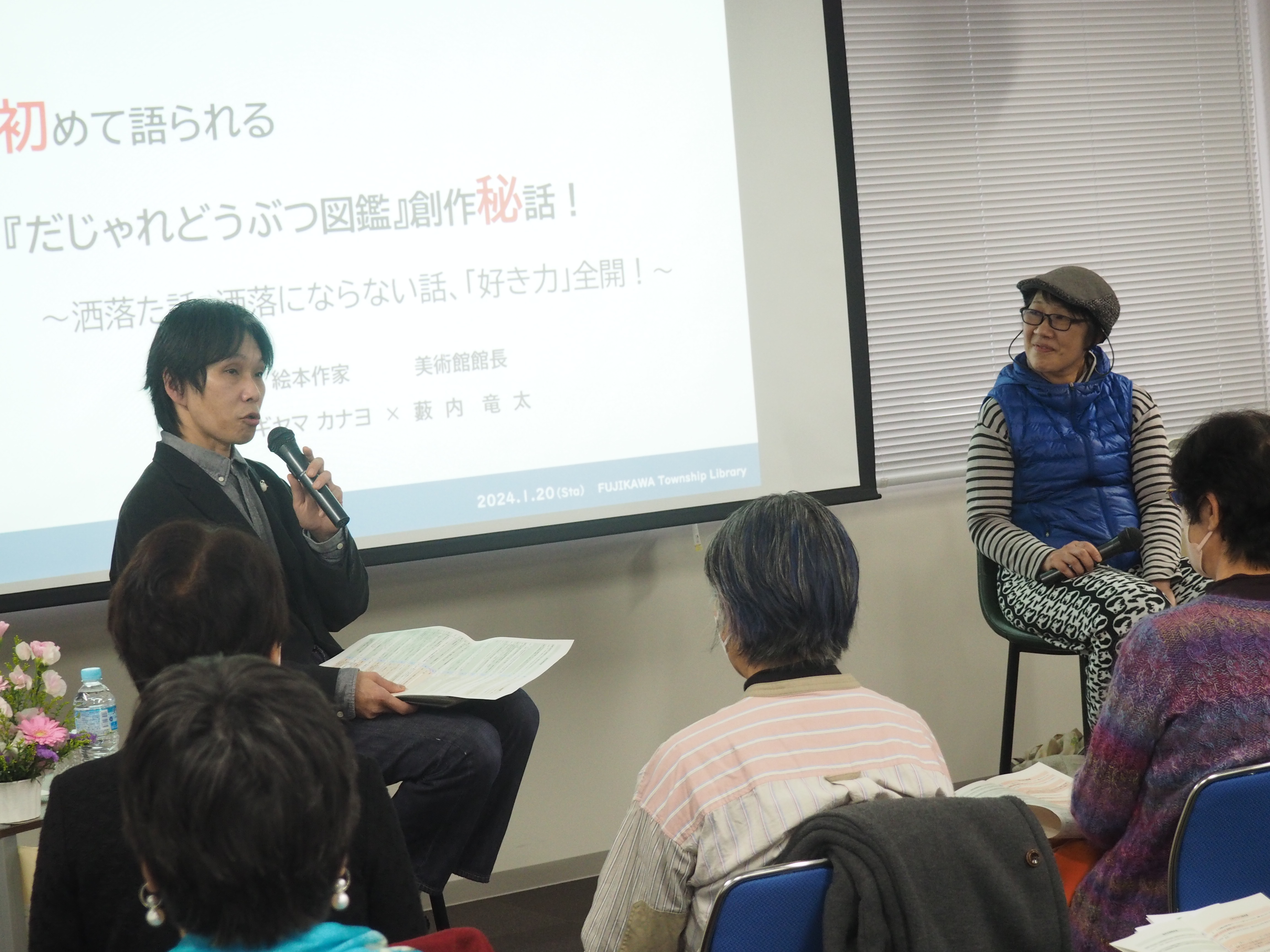 本トークイベントは、開館記念イベント第2弾として企画したものです。これに先駆けて薮内正幸さんの原画展を1月5日から開催し、当日の午前には、ワークショップ「富士川町立図書館スペシャル『だじゃれどうぶつ図鑑』を作ろう」が行われ、子どもたちのオリジナルの「だじゃれ動物」を作成しました。このトークイベントは、動物画家の薮内正幸さんが絵を手がけて、絵本作家のスギヤマカナヨさんが文章を担当した『だじゃれどうぶつ図鑑』(偕成社)制作の舞台裏に迫るという初めての企画。薮内正幸さんの長男で薮内正幸美術館館長の藪内竜太さんと絵本作家スギヤマカナヨさんの笑いあり、涙ありの対談の一部をご紹介します。